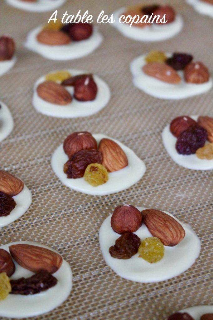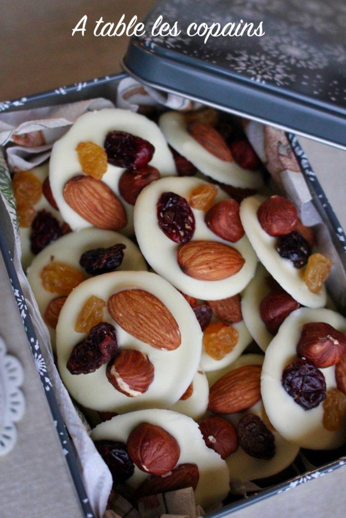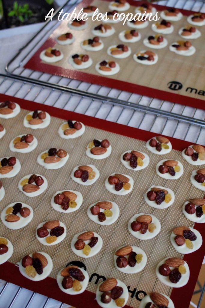 Même chose que pour le chocolat noir sauf pour la température qui doit être entre 45°C et 50°c. La température de conservation doit être également un peu plus fraîche que pour le noir, le chocolat blanc ramolli plus vite. Pour les blancs je n’ai pas mis de noix qui sont claires, j’ai préféré trancher les couleurs avec une noisette, une amande, une cranberry, et un petit raisin blond.