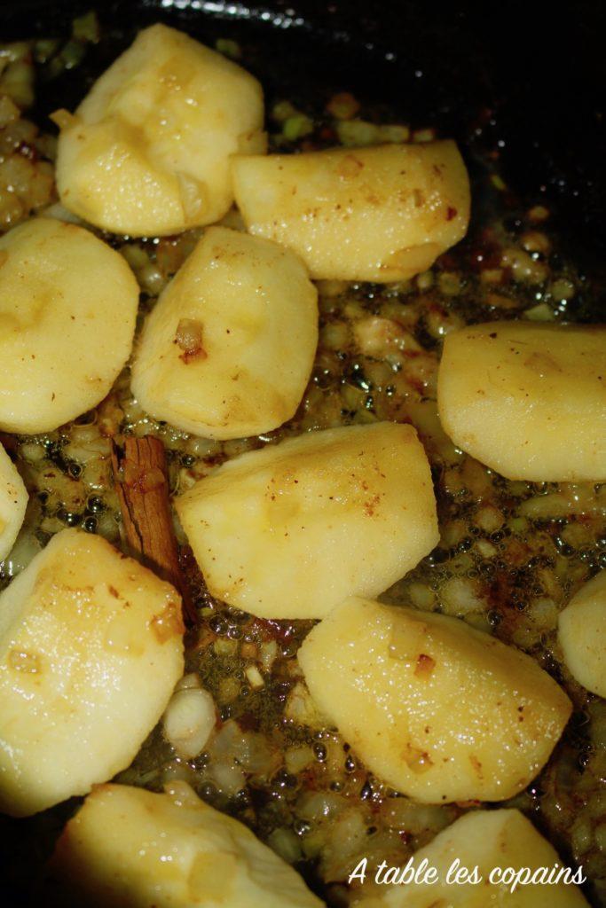 Versez l’oignon coupé en tout petit dans la cocotte, faire revenir dans les sucs avec le bâton de cannelle. Dès que les oignons sont translucides mais avant qu’ils colorent, ajoutez les quartiers de pommes pelés et coupés en 4. Retournez les à mi-cuisson. Lorsque les quartiers de pommes sont colorés, retirez les et réserver les dans un plat allant au four.