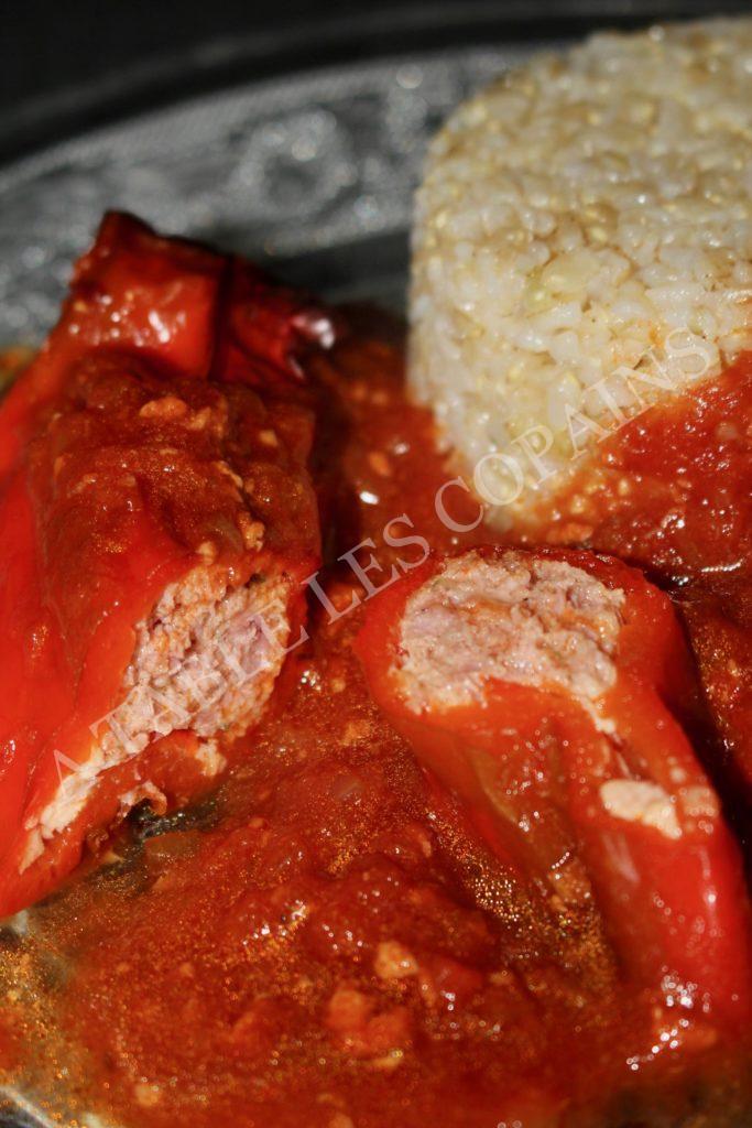 Poivrons corne de taureau farcis aux trois viandes, et sa sauce tomate épicée.