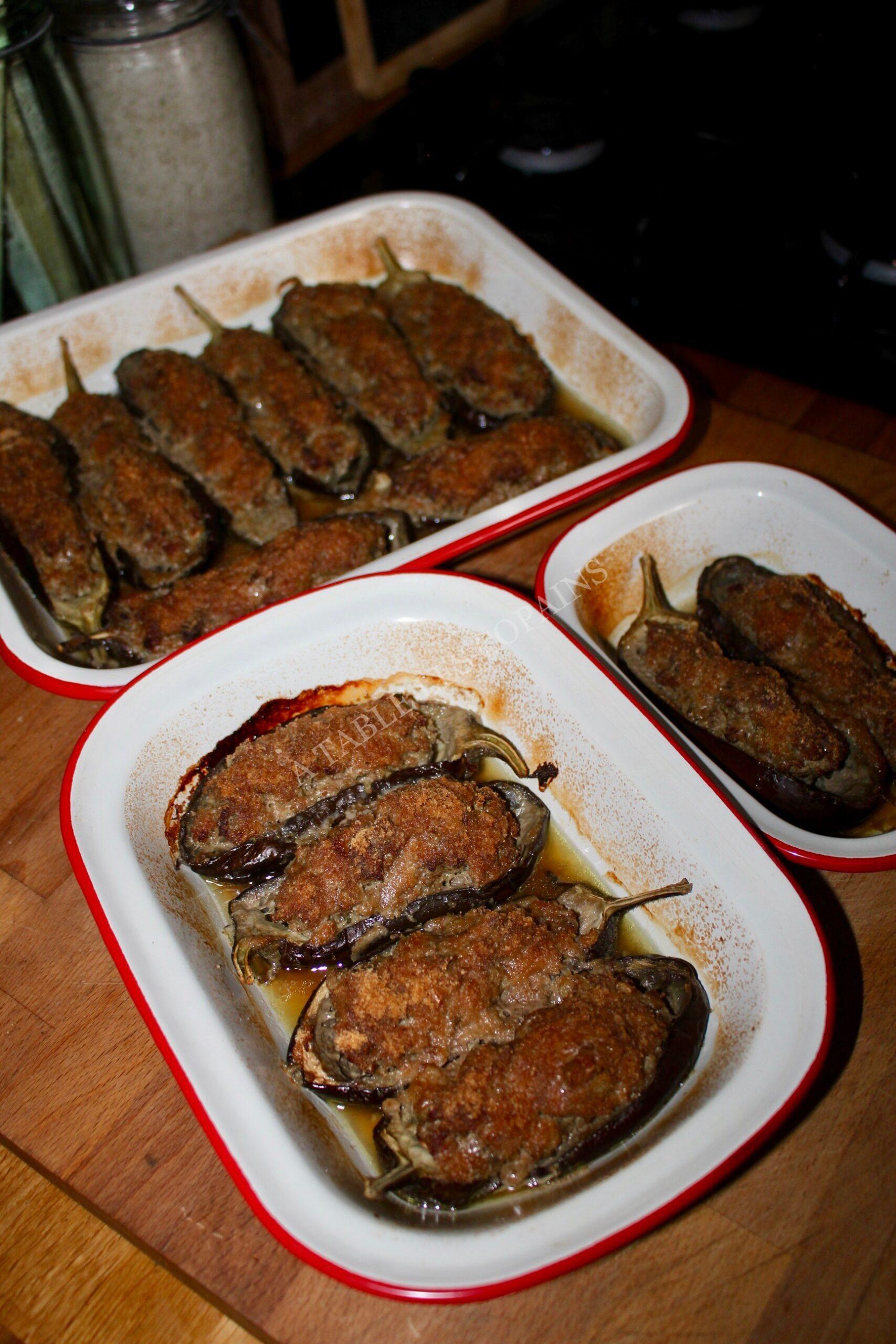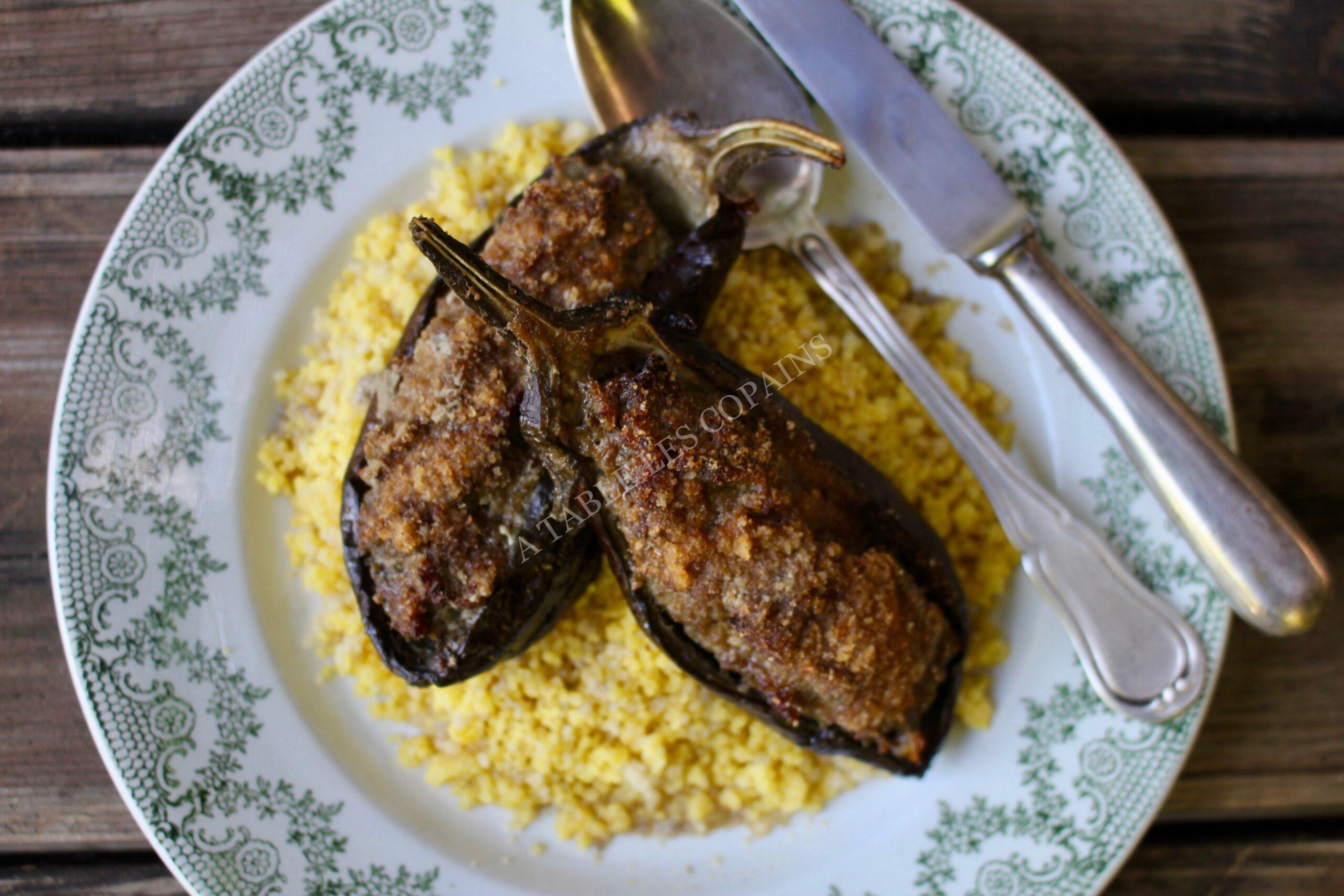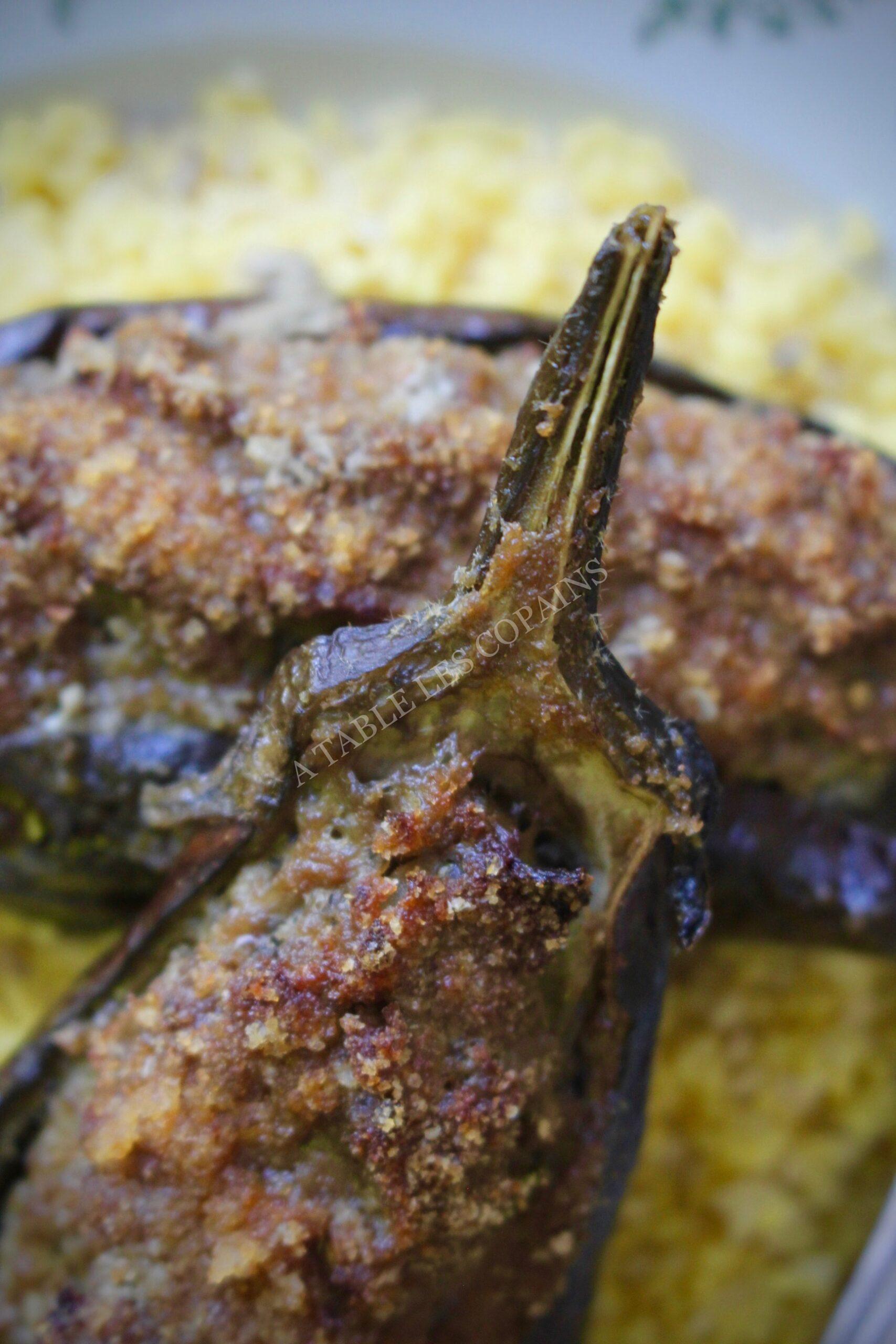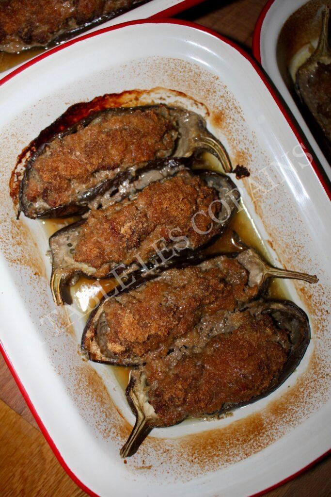 Disposez les aubergines dans un plat, ou plusieurs plats, en les serrant quelque peu. Remplir les aubergines avec la farce, n’hésitez pas à faire un beau monticule. Saupoudrez de chapelure, versez un petit filet d’huile d’olive sur l’ensemble, puis mettre au four à 150°c en chaleur tournante pendant environ 1 heure. Le temps de cuisson dépendra de la grosseur de vos aubergines et donc l’épaisseur de la farce. Si vous avez choisi de grosses aubergines, le temps pourra être bien plus long, les miennes, dans le cas présent, étaient petites.