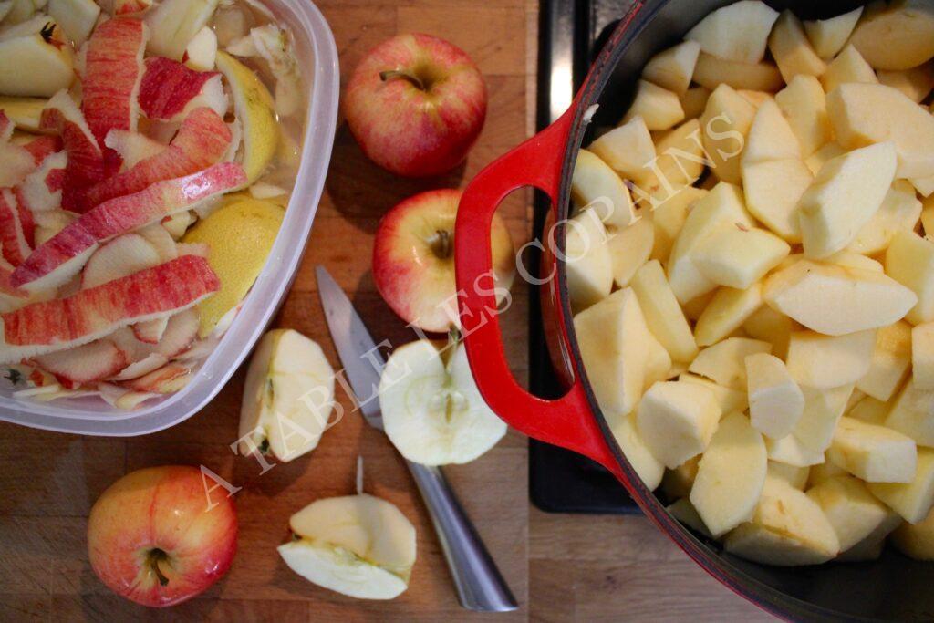 Recouvrir d’eau vos épluchures de pommes, les trognons et surtout n’oubliez pas les pépins ! Mettre le jus de citron. (Si vous devez faire votre gelée le lendemain d’avoir éplucher et que vous ne souhaitez pas congeler, mettez les telles que précédemment, dans l’eau citronnée et dans un récipient fermé, la nuit au frigo. Elles commenceront à s’infuser à froid et ne s’oxyderont pas)
