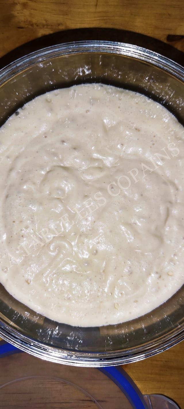 Recouvrir d’un cellophane et laissez reposer au moins 2h. Je rappelle que le temps de pousse, ici le temps de repos, varie selon la température. Il faudra observer que votre pâte ai gonflé et fasse des bulles, c’est impératif.