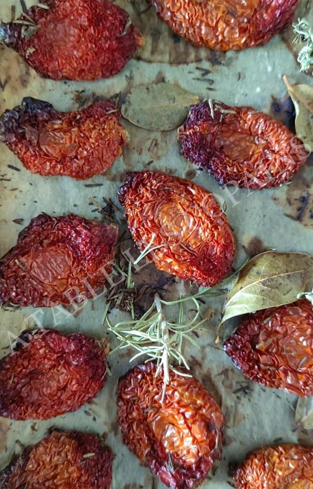 Lavez les tomates et coupez les en deux dans la longueur. Retirez toutes les graines. Déposez les sur un papier sulfurisé, face coupée, vers le haut. Saupoudrez avec le sel, le sucre et les herbes. Ajoutez l’ail en chemise juste écrasé avec le plat du couteau et un bon coup de paume. Les mettre au four pour au minimum 9h à 90°c / 100°c ça dépendra de votre four si c’est un nerveux ou un fainéant, vous êtes censé le connaître lol ! Vous pousserez le séchage si vous constatez que ça manque, n’hésitez pas ça peut prendre 12h si vos tomates étaient grosses. On retournera les tomates toutes les 3 heures et on ouvrira la porte du four toutes les heures, histoire de faire échapper l’humidité régulièrement (Là vous venez de vous dire : « et merde ! je peux pas le faire la nuit, quand je dors » hahaha !) Lorsque vos tomates sont prêtes, remplissez un pot. Faites chauffer une petite casserole d’huile d’olive, surveillez, à la première légère fumée, versez sur vos tomates, attention aux éclaboussures. Fermez aussitôt le pot muni d’un caoutchouc.