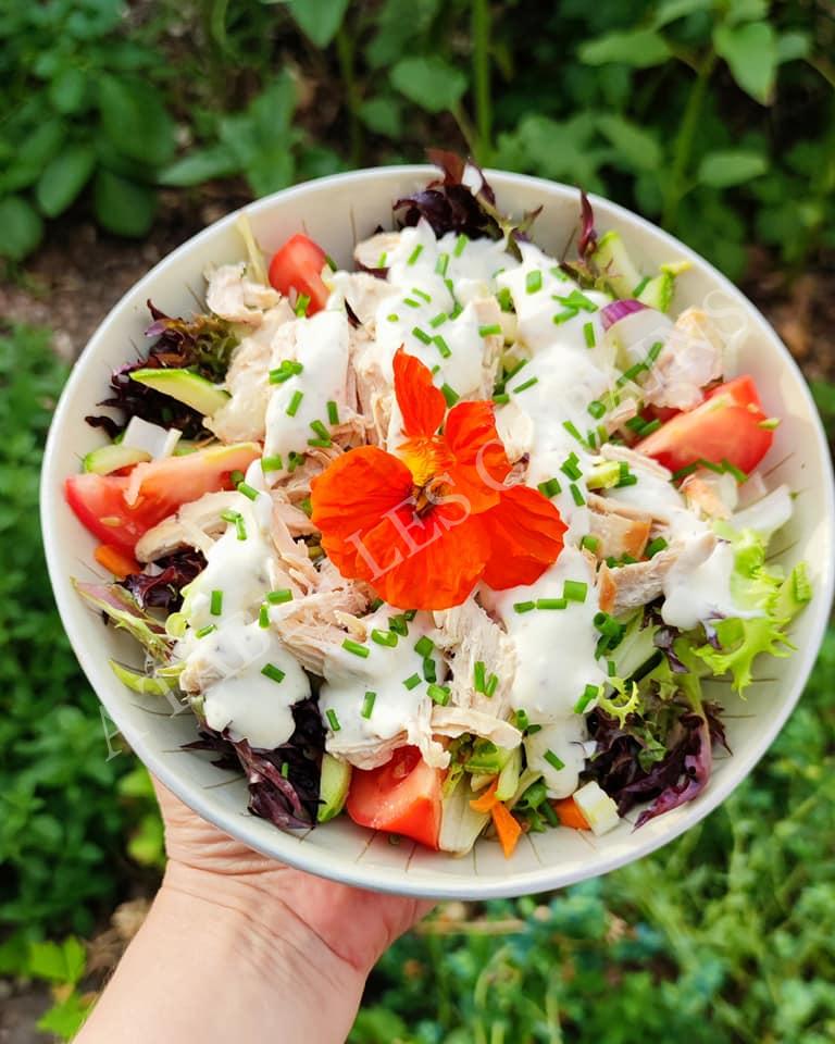 Disposez la salade au fond. Ajoutez les courgettes et carottes mélangées et les tomates. Effilochez les filets et disposez 1/2 filet par assiette. Dressez la sauce dessus et parsemez généreusement de ciboulette. Si au jardin, vous avez des capucines, des soucis, du pissenlit ou de la bourrache, n’hésitez pas à colorer votre assiette avec.