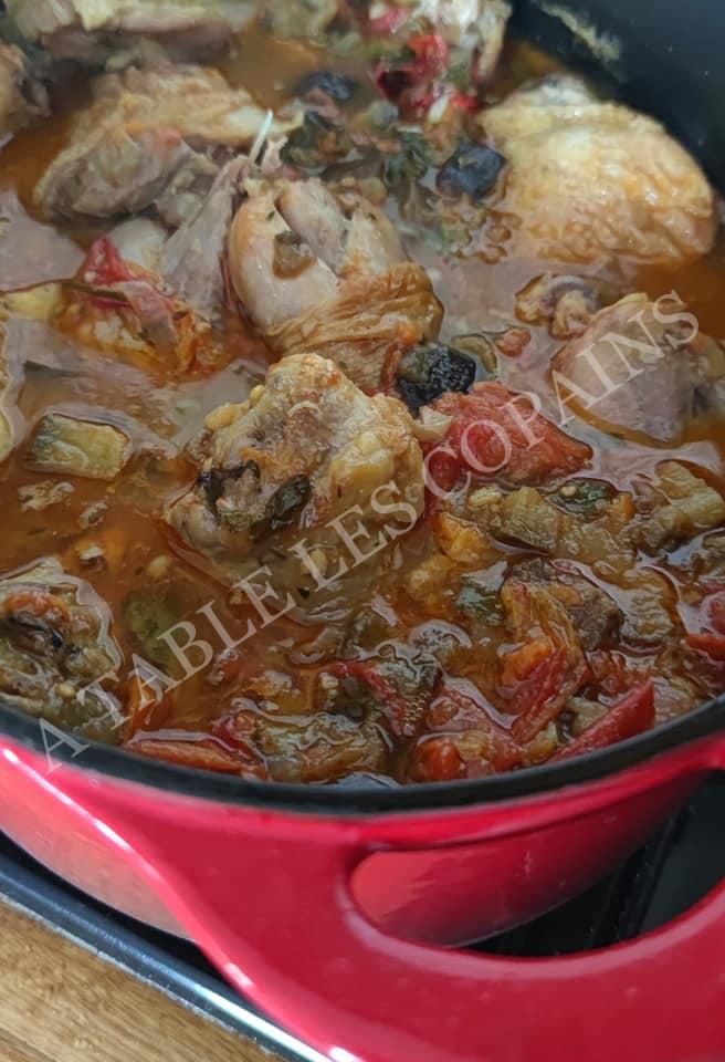 Poulet mijoté en cocotte aux aubergines, tomates et piments