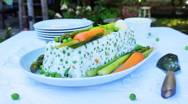 Terrine printanière au chèvre frais fermier et petits légumes nouveaux, vinaigrette aux cosses de petits pois et à l’huile d’olives noires…